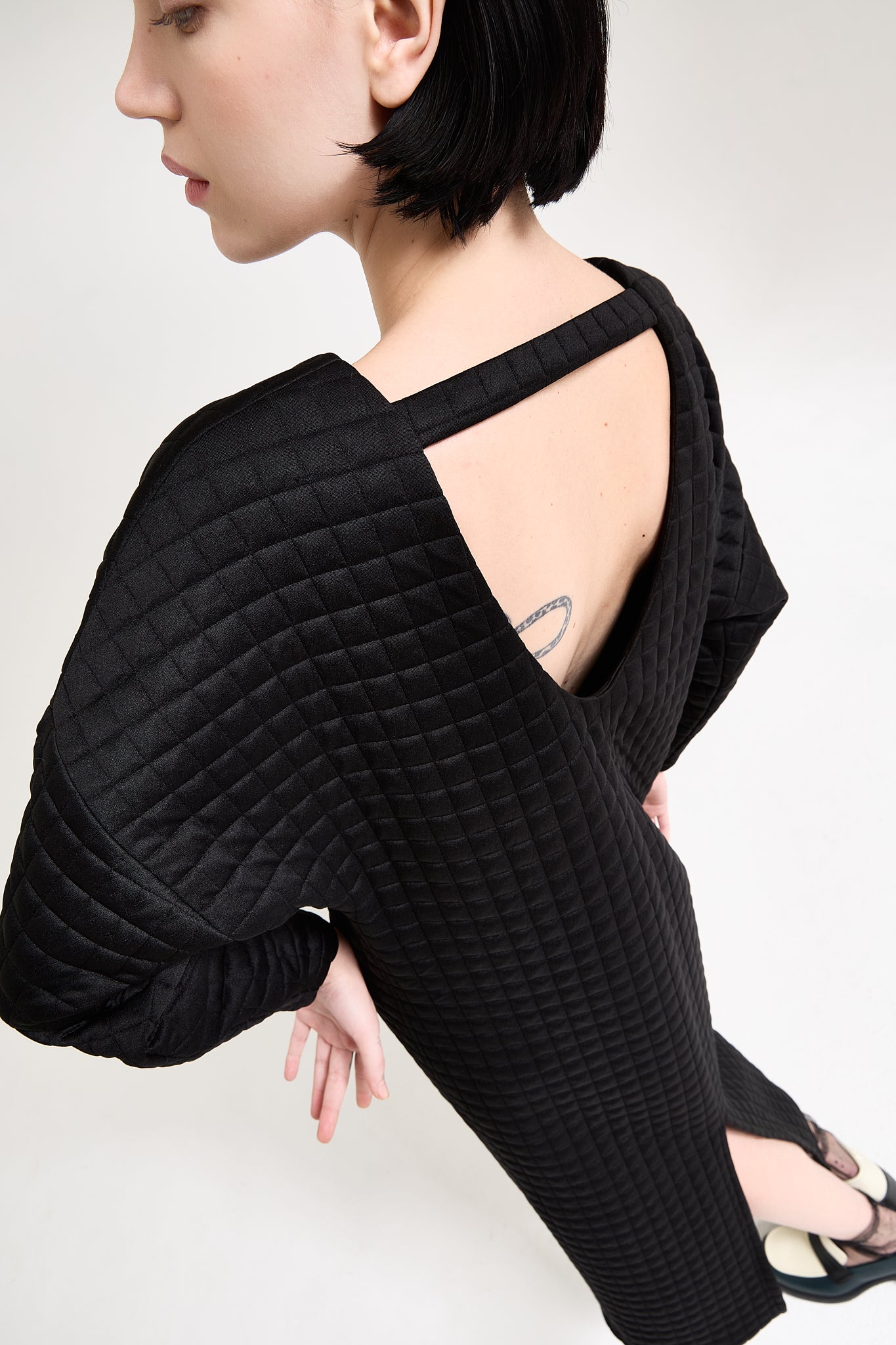 > Clean lines meet a sculptural square puff fabric for a look that’s quietly confident